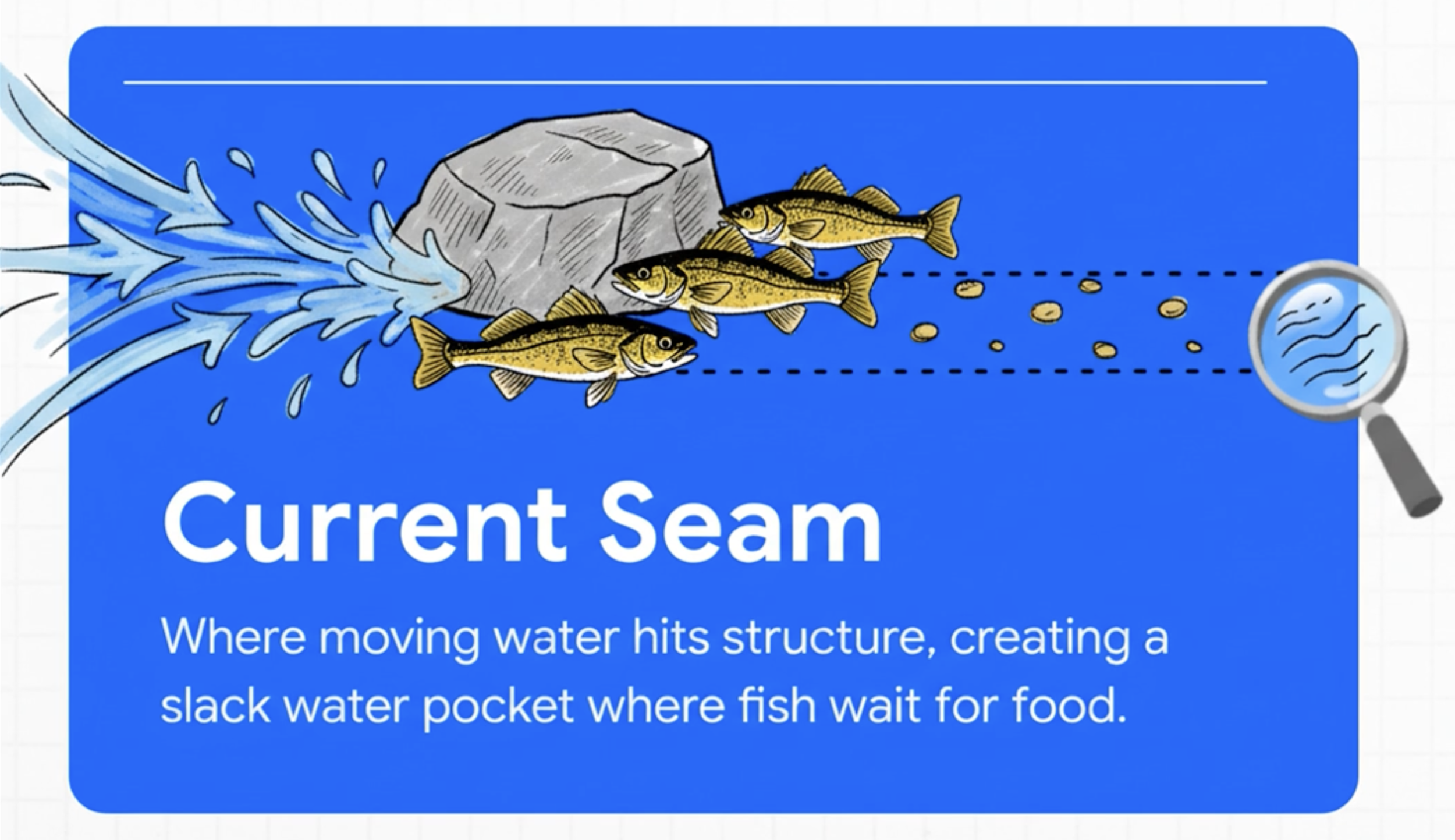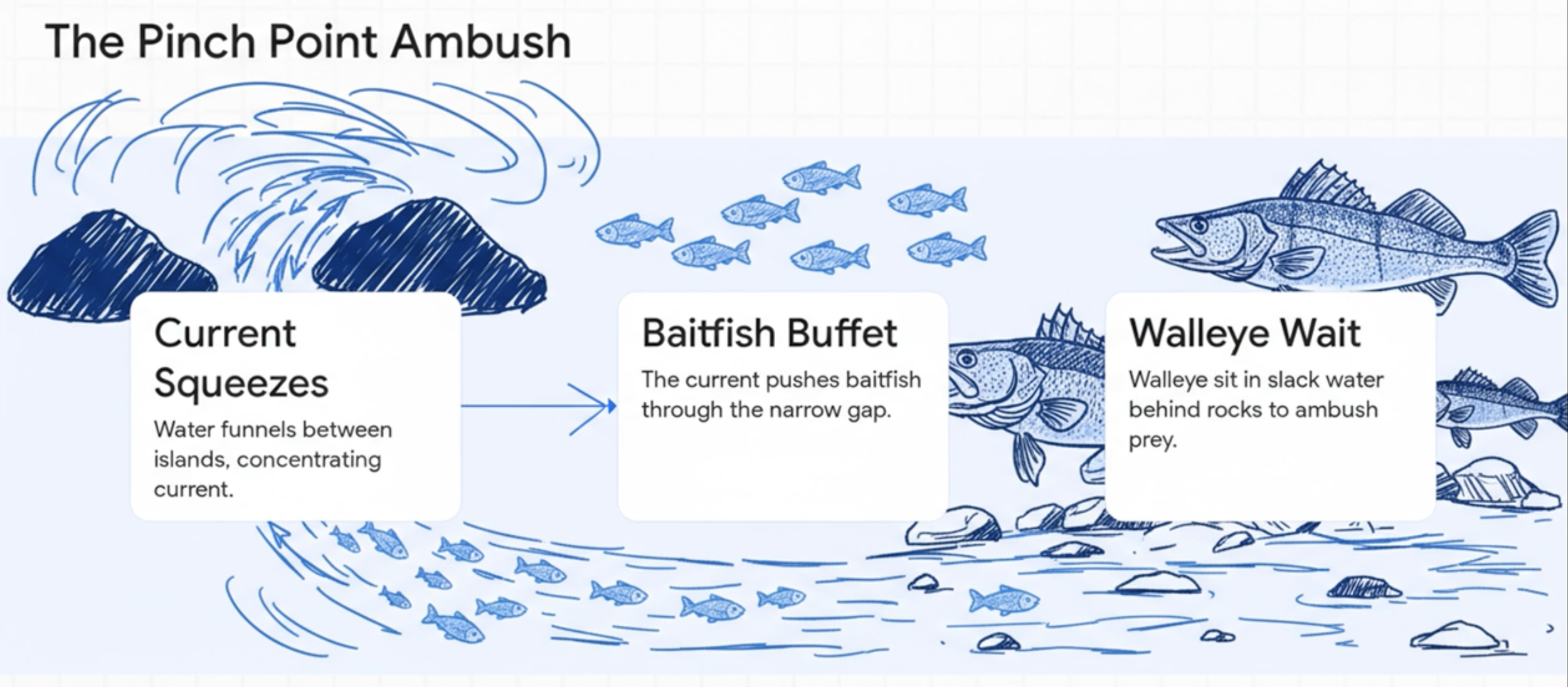 Water is always moving, even if it looks still. Fish set up on "current seams"—places where moving water hits a rock pile or a point.The "Pinch Points"
