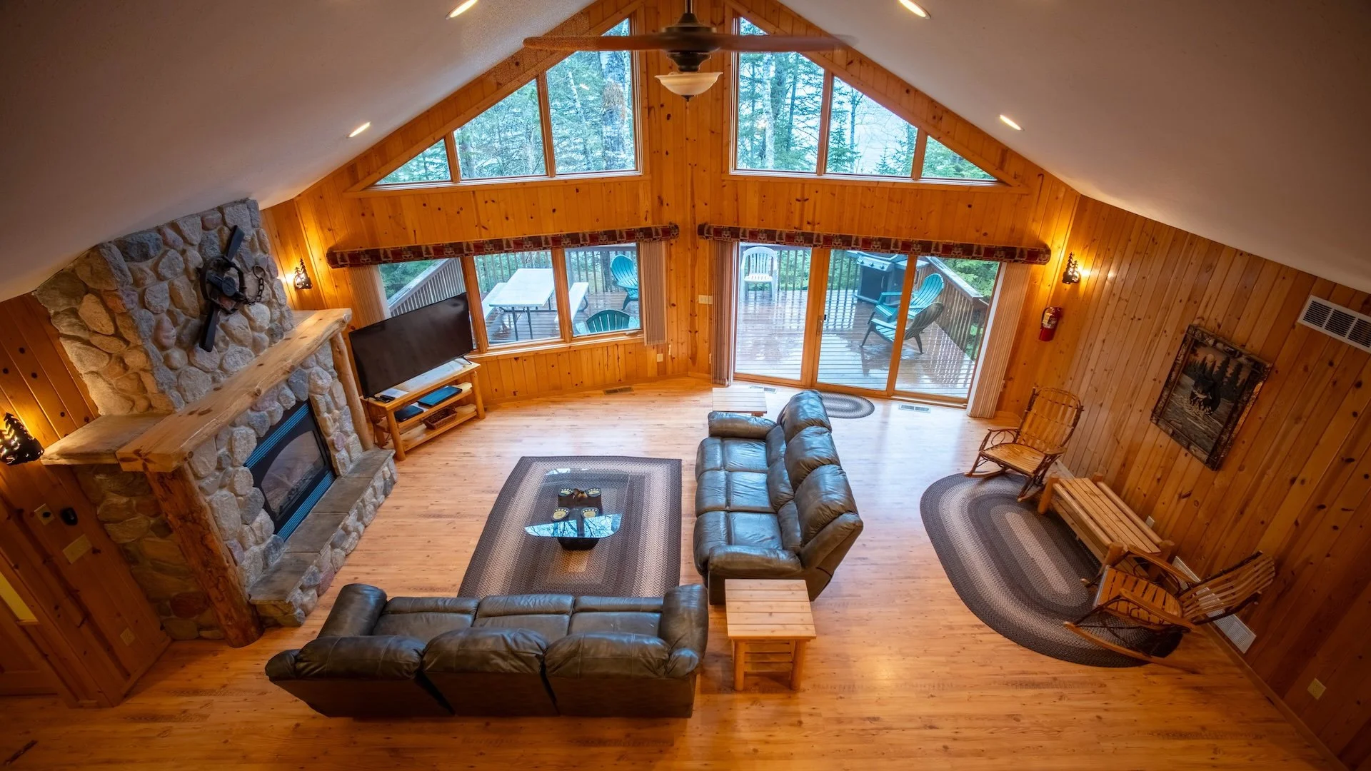 The Ultimate Social Hub: The heart of this home is the Large Great Room. It features a stunning rock fireplace that just screams 'Northwoods cozy'. It is designed as a central gathering spot where your entire group can hang out, play games, or just catch up after a day on the lake.